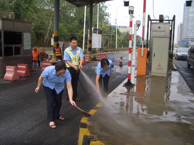 8月24日上午,庙山服务站组织行管后勤人员以及现场当班职工对收费现场进行全面清扫和冲洗。大家干劲十足,有的清扫,有的手持高压水枪冲洗、有的拿着刷子、抹布,对收费现场的路面、安全岛、收费亭以及防撞柱等设施进行了彻底清洗。 经过一上午的彻底清扫和冲洗,从地面到收费亭焕然一新。