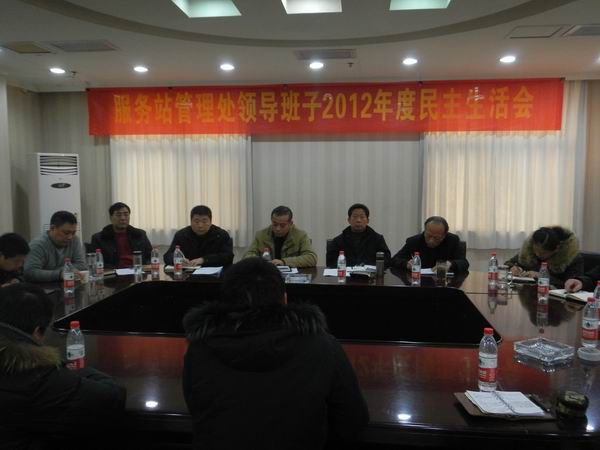 元月21日下午,服务站管理处党总支召开处领导班子2012年度民主生活会。处领导班子全体成员参加了会议,所属各服务站站长、党员、职工代表、先进标兵、党风廉政监督员等18人列席会议。中心党委委员、副主任周胜利同志,党委工作部部长裴嵩华同志,专程莅会指导。会议由服务站管理处党总支书记尹捷同志主持。