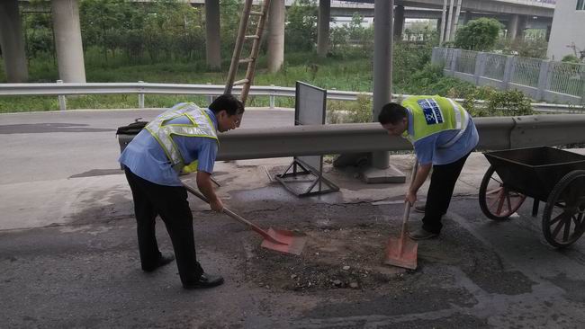 7月18日上午,谌家矶服务站“学雷锋”青年志愿者们带上锄头和铁铲,借了手推车拉来两车细沙和石子,将站区坑凼填平。近期,由于重载车辆碾压和暴雨冲刷等原因,使谌家矶服务站收费现场和周边道路坑坑洼洼,最深的坑有30厘米,里面还有不少积水,过往车辆途经这里都避免不了要狠狠地颠一下。