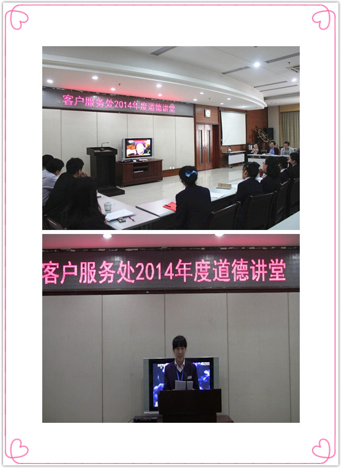 据悉,客户服务处已连续两年开展《道德讲堂》活动,去年《道德讲堂》主题为“爱党爱国,诚实守信”,今年以“孝老爱亲”为活动主题。该处旨在通过《道德讲堂》活动的开展,进一步加强职工队伍建设,培育广大职工社会主义核心价值观,培养职工“从我做起”,传承中华民族传统美德。
