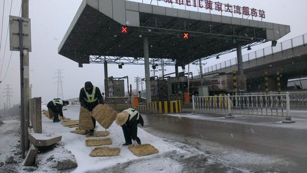 2月8日,农历腊月二十八早上,天空飘起了漫漫雪花,为迎接新春佳节的到来,给广大司乘人员提供一个洁净、亮美、安全的出行环境,服务站管理处所属的快活岭服务站、黄家大湾服务站党员群众齐行动,冒着风雪,劲头十足,把收费车道和岗亭打扫得焕然一新,并迅速启动了融雪防冻应急预案,在站区现场过道铺设草垫,做好根据天气情况随时抛洒融雪用盐的准备工作。