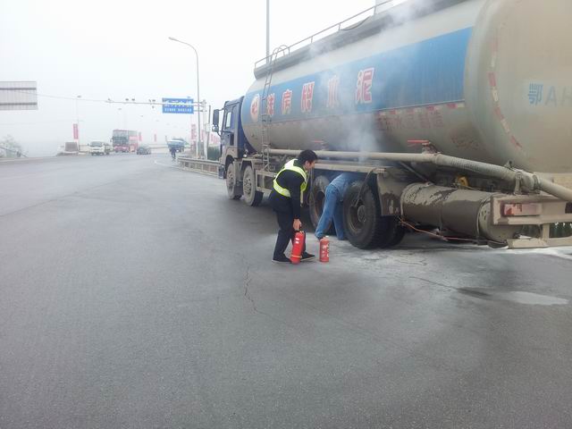 3月19日上午10:35时,一辆市籍大型水泥罐车路经谌家矶服务站出城车道时,收费三组收费员韩雪松突然闻到一股刺鼻橡胶味,他仔细一看,该车后排车轮正冒着黑烟。韩雪松马上意识到情况危急,于是跑下安全岛追赶已驶出的车辆,并呼喊司机示意停车。当车停下来时,车辆后排车轮已经冒出火苗,班组其他员工见此情景,急忙拿起备用的灭火器,前往救火。