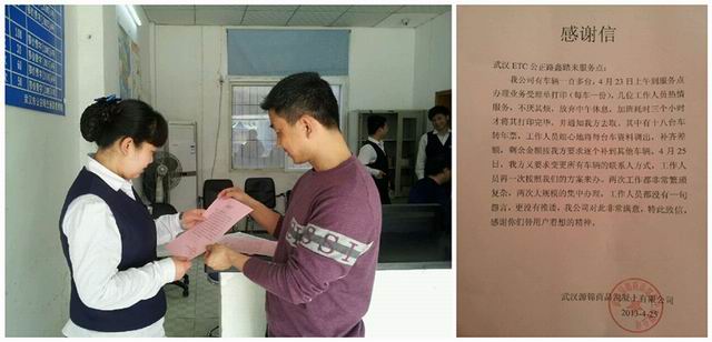 4月下旬,公正路服务点在为武汉源锦商品混凝土有限公司100多台车辆办理ETC业务过程中,发现该单位每台车辆通行费等相关信息不一致。为尽可能方便客户,满足客户的意愿,该服务点工作人员逐台核对车辆信息,办理补缴通行费差额、转年优惠票等手续。同时,又应客户要求变更了所有车辆的联系方式。两次大规模业务办理工作十分繁琐,该服务点工作人员耐心细致,热情服务,主动放弃中午休息时间,加班加点完成业务办理工作。该公司相关负责人非常感动,特送来感谢信。
