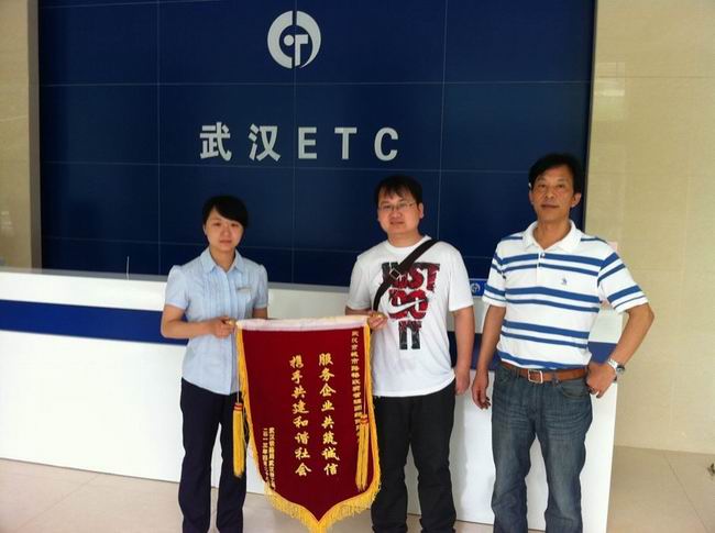 自2011年7月武汉ETC实施以来,各ETC服务点积极履行服务承诺,认真落实“企业直通车”服务机制,接待办理这样的大型单位数不胜数。致谢锦旗上“服务企业共筑诚信,携手共建和谐社会”两句褒奖,表达了广大客户对武汉ETC“服务共建和谐”的充分肯定和认可。