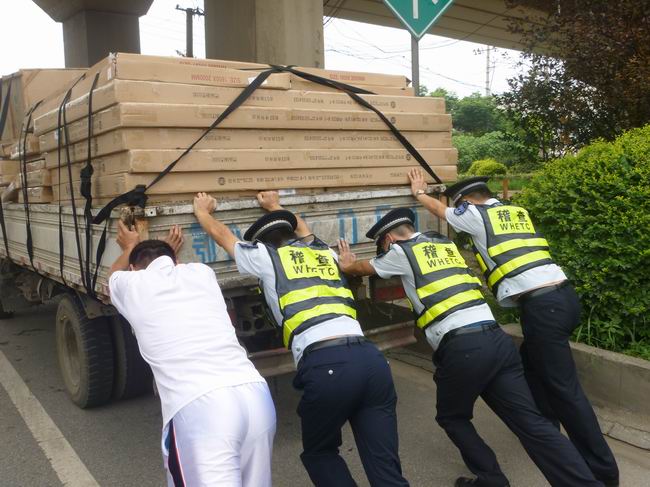 日前,稽查五中队十五分队在三环线长丰桥开展联合执法工作时,发现一辆满载货车停在百威立交桥附近,车旁的货车司机愁眉不展地一边打求援电话,一边挥手拦截过往车辆。见状,稽查队员主动上前询问,获知该车因高温抛锚无法启动,眼看交货时间就要到了,车主焦急万分,不知所措。在场的稽查队员听闻此情况后,立即帮助货车司机推动起沉重的故障车。正值烈日当空,炎阳炙人的时分,推车的队员们已汗如雨下,全身湿透,可他们顾不上擦一把汗,全力以赴地帮助司机重新启动货车。当货车的发动机再次响起轰鸣声时,该车司机连声向稽查队员表达感激之情,同时送上烟和饮料以示谢意,但被队员们一一婉绝。