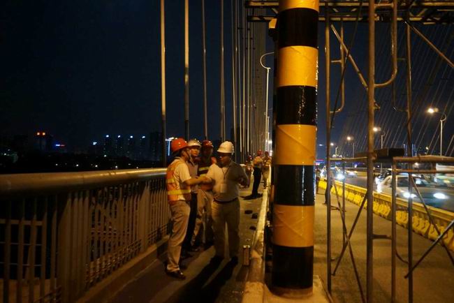 在长江二桥慰问现场,中心领导察看了工程项目部、职工生活区和桥梁施工现场,并与施工人员进行亲切交谈,详细询问了目前工程进度情况,对他们为长江二桥维修工程建设而舍小家顾大家所做出的贡献给予赞赏,鼓励他们继续发扬顽强拼搏、艰苦奋斗的精神,团结一心、迎难而上,圆满完成维修工程建设任务。