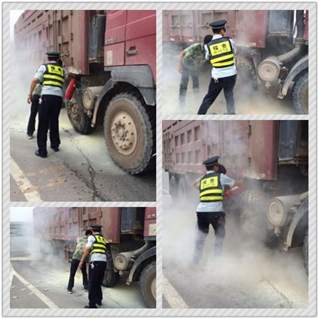 近日,天气燥热,路桥中心稽查二中队五分队在谌家矶服务站开展路桥通行费稽查工作。一辆车牌鄂A籍红色翻斗车右前轮胎冒着火苗向服务站驶来,站在安全岛前指挥车辆进站的分队长赵争发现此危情,急忙示意货车司机停车,但该司机显然对险情毫无意识,仍继续驶向服务站车道。这时火势加大,离车轮胎着火点不远处就是车辆油箱,随时有发生爆炸的危险。危急时刻,站在车道内执勤的稽查队员龚伟快速走下道口将货车拦停,在不明所以的司机惊诧下,立刻提起车道内的灭火器冲向了正在燃烧的货车。其他稽查队员也闻讯赶来,在拨打119火警电话,并对司机讲明原由后,纷纷加入救援的行列。经过众人的合力施救,大火终于被扑灭,虽然货车轮胎严重烧毁,但是车辆得以保存,现场无人员受伤。