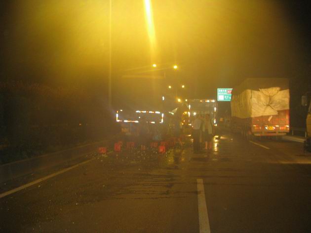 7月4日22时25分,正在巡查的长丰桥管护一队接到监控中心电话称:“三环线外环K11处,发生五车相撞重大交通事故。”接警后,管护队长黄国圣立即上报情况,并急速赶往出事地点。22时35分,赶到事故现场的长丰桥管理所所长和管护队员立即配合交警,用反光锥设置成安全隔离带,协助交警疏导交通,以防次生事故发生。同时,迅速组织保洁人员一道快速将路面散落的大量碎玻璃清理干净,确保三环线畅通。