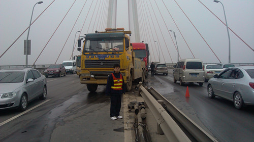 2012年3月19日6:50时,白沙洲大桥管理所管护队巡检至白沙洲大桥中段时,发现大桥中间隔离波纹板上“骑”着一辆红色加长重型大货车,车头下部严重变形,底部发动机被撞破裂,机油流出污染了约20平方米桥面,撞损立柱18根,波纹板约50米,上下游各被堵塞了1股车道。管护队立即拨打“122”向中环大队报警,按照应急预案要求立即派人到现场处理维修波纹板。其他管护队员立即将反光筒放置在事发现场周围,防止其他车辆撞上发生二次事故,并在来车方向引导车辆安全通过。在肇事车辆被拖走后,管理所又立即组织保洁人员对事故现场进行清理,受阻交通恢复正常。