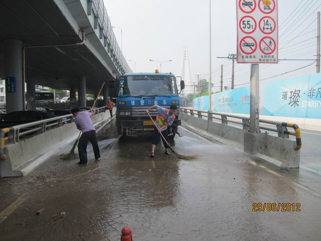 6月29日早晨,管理所管护员、汉阳三公司清扫人员和洒水车按预期计划到达,管护员用反光筒和车辆将污染区域进行隔离,为清扫人员打造安全作业环境;清扫人员和洒水车在管护员的指挥下,对漏撒的泥土沙石路面反复冲洗清扫。最后,通过管护员、清扫人员的共同努力奋战近6小时,桥面近2000平方米污染段基本清除干净。