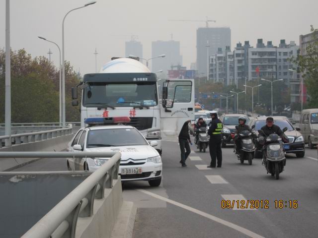 管护人员在交管支援下,身着反光背心,设置交通引导牌,反光筒分别在月湖桥汉阳段入口处和下游主桥与匝道结合处设立过磅点,重点对重型大货车进行过磅测量,对二轴小型货车、油罐车、工程车、三轴(渣土车、水泥罐车)、五轴天然气运输车及夜间通行的四至六轴的重型大货车,采取桥面现场人工24小时实测统计;对2台超载大货车主进行了交通法规宣传教育。