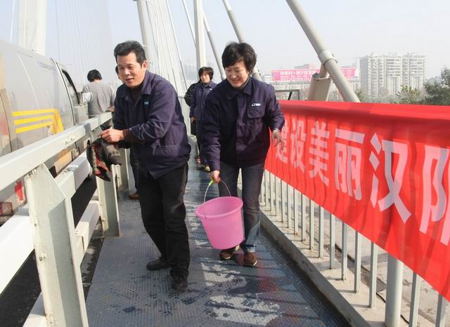 12月5日上午9时,一面红色鲜艳的“志愿者服务”旗帜迎风飘扬在月湖桥主塔旁,来自中心道路桥梁管理处机关全体人员和所属7个管理所约40多名身着桥管制服志愿者来到月湖桥桥面,一次“践行文明、清洁桥梁”志愿者服务活动就此拉开帷幕。虽然已是冬季,天气很冷,但是参加志愿服务人员热情高涨,志愿者们开来水车,拿好水桶、抹布等工具,在主桥人行道处由汉阳向桥口方向一字排开,一部分志愿者负责提水,搓洗涮抹布,另一部分志愿者则认真地擦抹钢护栏,工作有条不紊,近3个小时的努力工作,月湖桥钢护栏设施更为干净了。