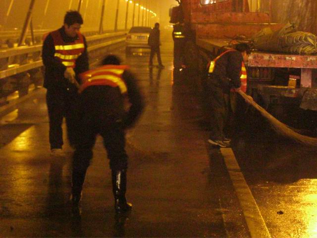 车祸事故造成桥面方钢防撞护栏、景观护栏、电缆线槽、路灯灯杆及灯具1套受损,桥面油污面积达450㎡,交通滞留,行车缓慢,天兴洲大桥管理所管护队员立即报警,所长迅速到达事故现场,配合青山大队交警对现场进行处置,疏导桥面滞留车辆,同时对事故现场散落的废弃物进行清理,用水马、反光锥筒、安全警示带对撞损部位进行封闭警示,避免次生灾害事故的发生。经过3个半小时有序的应急处置行动和交通疏导,于2月26日凌晨1时50分桥面车流恢复畅通。