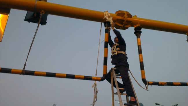 发现该类情况后,当班管护队迅速用反光锥将事故车道封闭,防止次生事故的发生,留守桥面疏导过往车辆通行。组织人员利用升降梯、铁丝、安全绳等简易器材,将撞损限高龙门架扶正,进行了临时加固处理,在桥面车流早高峰前抢修完毕,并及时清理了施工现场。