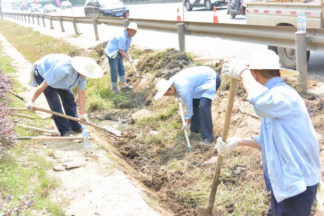 2013年5月23日,从三环线南段庙山立交起,至北段双桥村泵房,清淤工作全面展开,处机关全体人员和所属各管理所56人参与。在34℃的高温下,全体桥管人无畏骄阳,投入到清淤战斗中。三环线路边边沟最窄处宽0.5米、深0.7米;最深处宽1米、深1米,里面填充着杂草、淤泥、石块、过往车辆丢弃的废弃物以及长期积累的渍水,散发着阵阵恶臭。这些现状没有吓倒桥管人,他们摆放反光锥筒,分隔作业区,确保作业安全;他们站在边沟内,头戴草帽、身着反光背心,手持工具,精神抖擞进行清淤,汗水很快浸湿衣衫,灰尘弄脏了脸颊,没有人去理会这些,有的只是如何能又快、又好的完成工作。经过大家的共同努力,全天全处出动车辆13台次,人员56人,清理边沟700米,为接下来的清淤工作打下了良好基础。