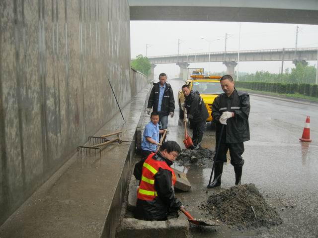 5月15日,风雨交加,天兴洲大桥管理所党员、入党积极分子及当班管护队携带作业工具,对三环线双桥村京广线下穿通道泵站排水边沟、涵管、挡渣板处存在的废弃物及淤泥进行清淤、疏捞。他们撬开排水边沟上的混凝土盖板,先用铁耙将涵管入口处挡渣板上附着的废弃物进行仔细清除,然后用铁锹对边沟积存的泥沙和淤泥进行疏捞,通过近3小时的疏捞工作,共清除废弃物及淤泥1.5吨,排水边沟内的积水得到迅速的排放,排水管道恢复了畅通,有效的确保了三环线的安全畅通。
