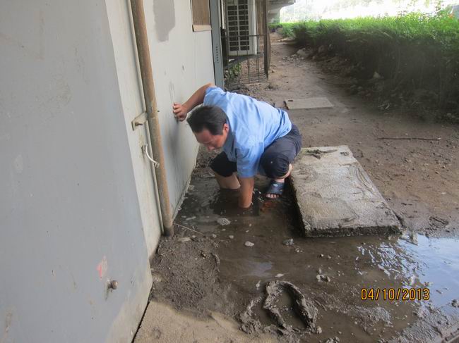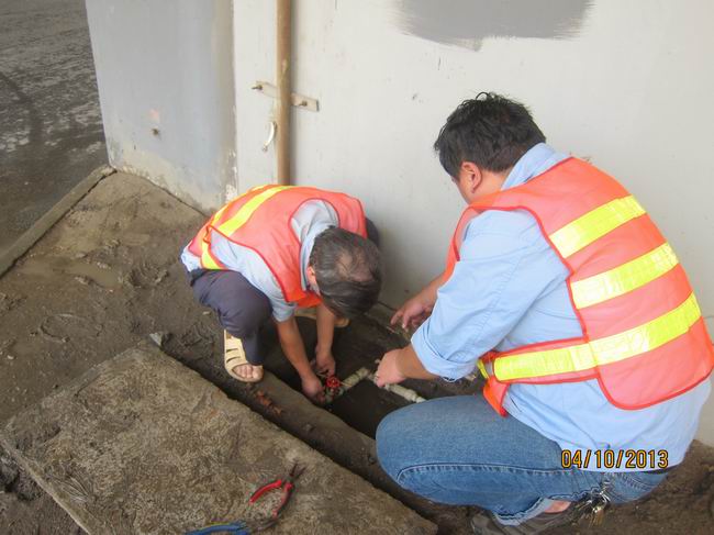 队员们挽起裤脚,来到渍水的发源地—花坛内仔细查找,发现水是从一块预制盖板下冒出来的,值班人员董明山一方面让队员立即关闭该处自来水总阀,他们掀开预制盖板,发现该处安装的自来水阀,因阀门松动而漏水,他们用簸箕将该出的积水一点一点的舀出来,找来铁丝,将松动的水阀进行了加固。最后他们打开总阀,对修理后的水阀进行了认真检查,在确认无漏水情况后,才将掀开的预制盖板重新盖好。